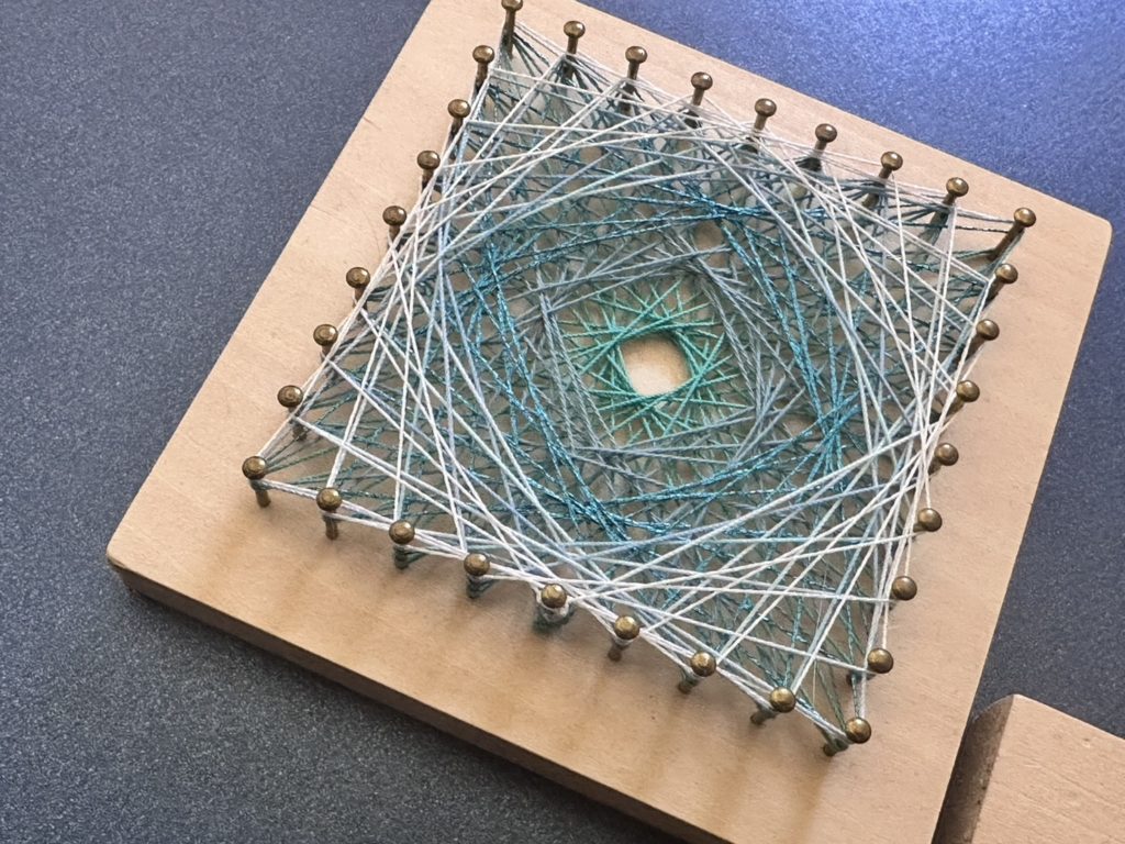 板にピン(釘)を打ち、規則的に糸をかけていくことにより様々な模様を作るアート。