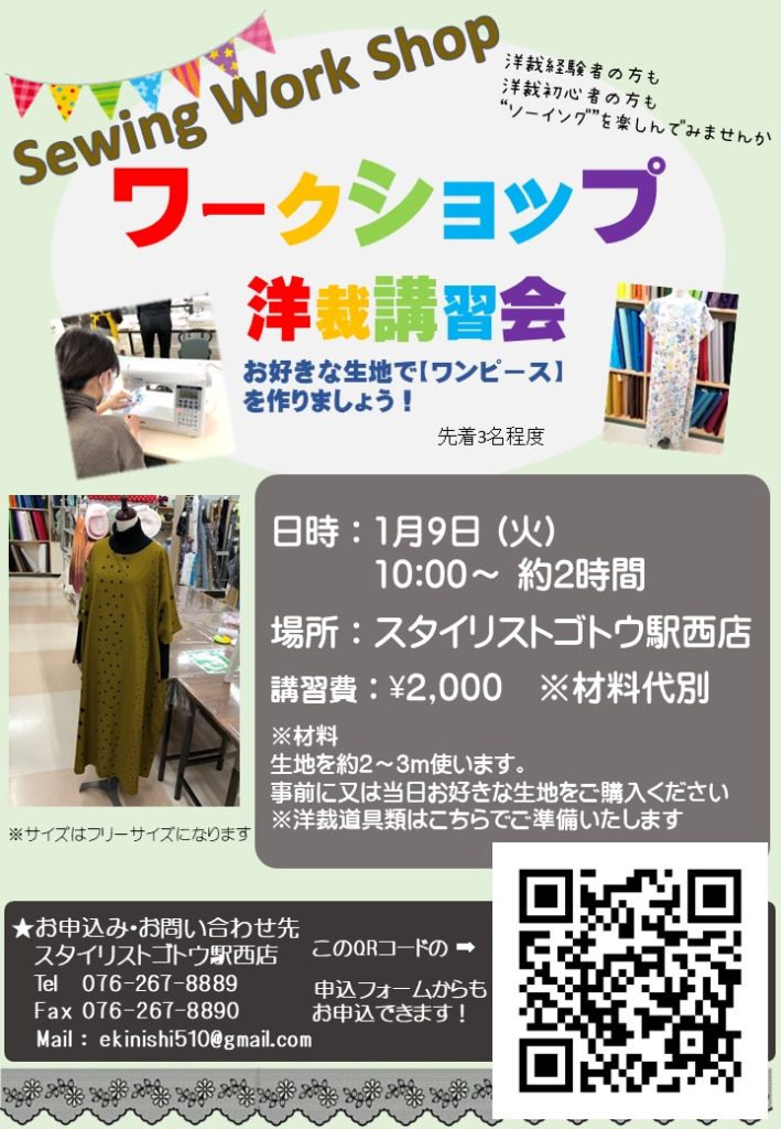駅西店 1月開催 ワンピースソーイングワークショップ