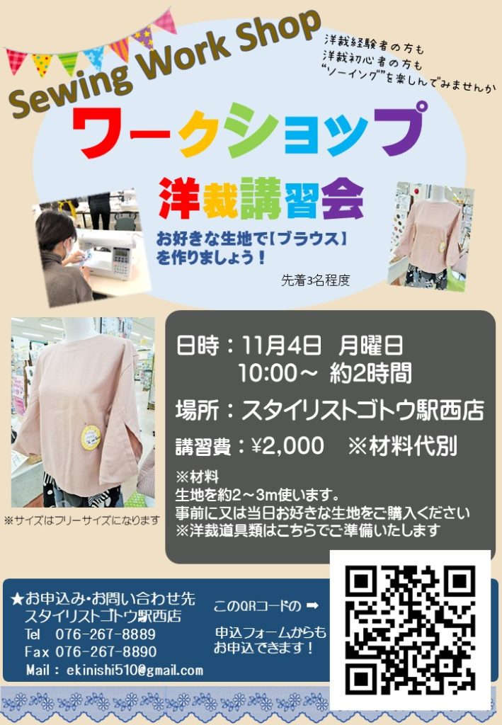 駅西店 11月開催 ブラウスソーイングワークショップ
