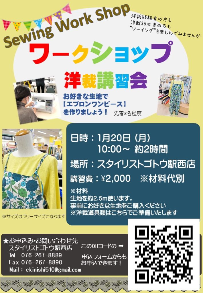 駅西店 1月開催 エプロンワンピースソーイングワークショップ