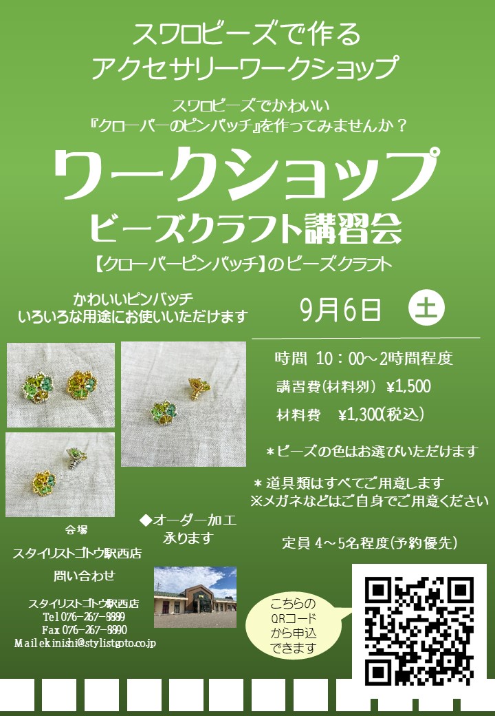 ビーズワークショップ『クローバーピンバッチ』(駅西店)