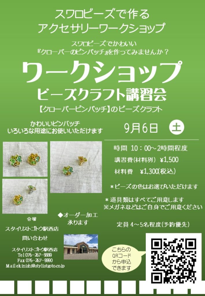 駅西店 9月6日開催 スワロフスキービーズでピンバッチを作るワークショップ
