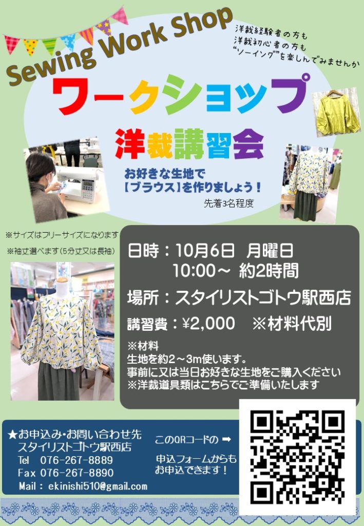 駅西店 10月開催 ブラウスソーイングワークショップ