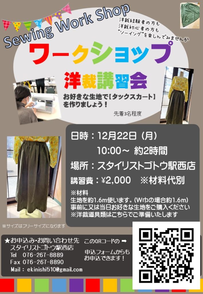 駅西店 12月開催 タックスカートソーイングワークショップ