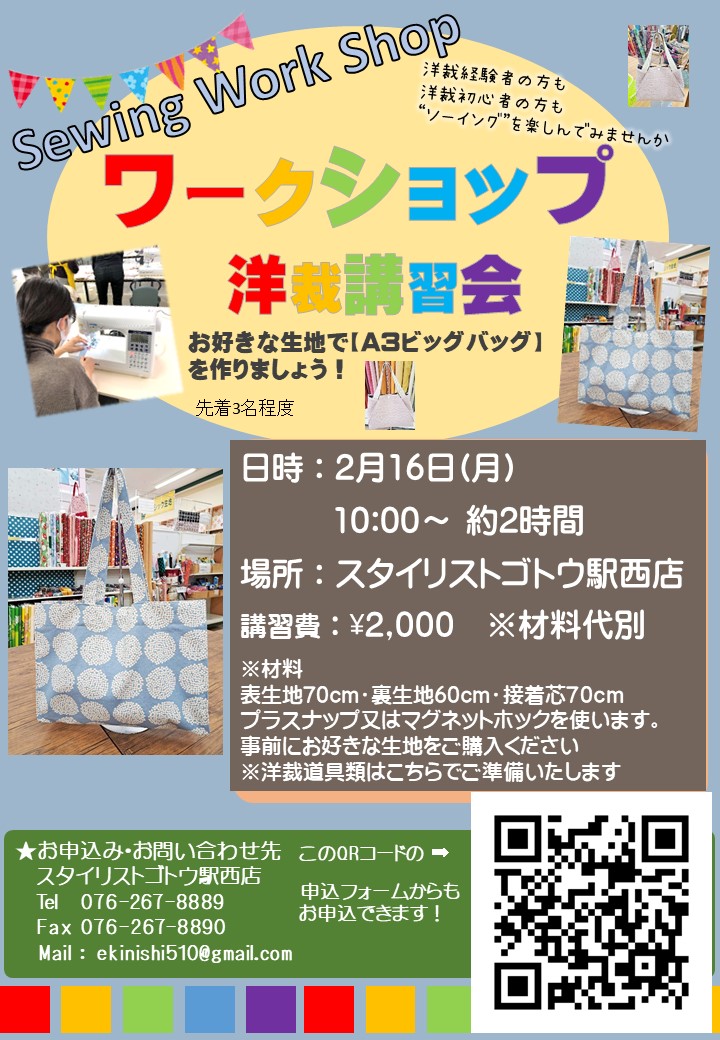 ソーイングワークショップ『A3ビッグバッグ』(駅西店)