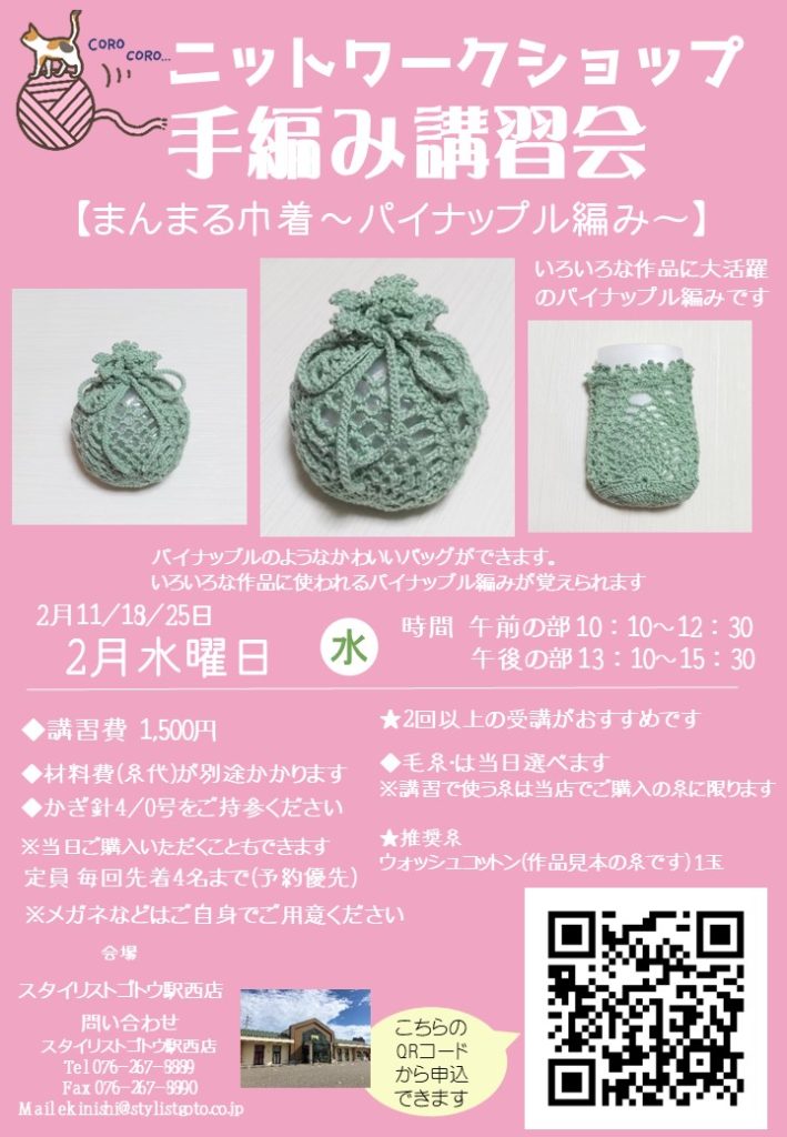 編み物ワークショップ『まんまる巾着~パイナップル編み〜』(駅西店)