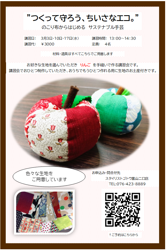 のこり布からはじめる サステナブル手芸をテーマにした講習会(富山店)