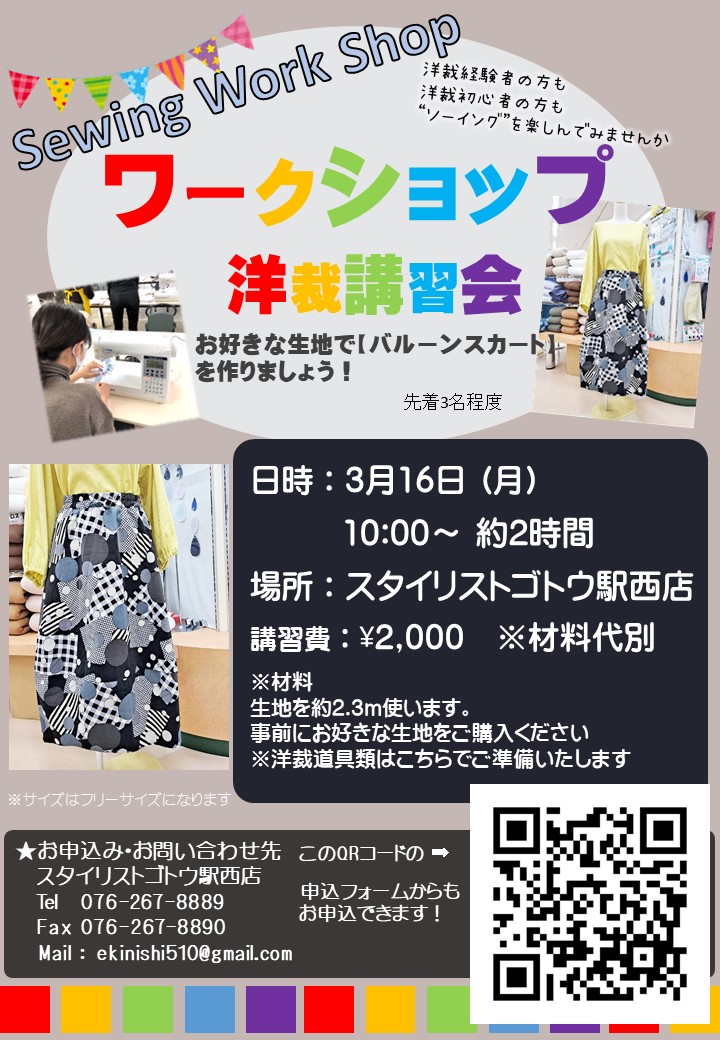 ソーイングワークショップ『バルーンスカート』(駅西店)