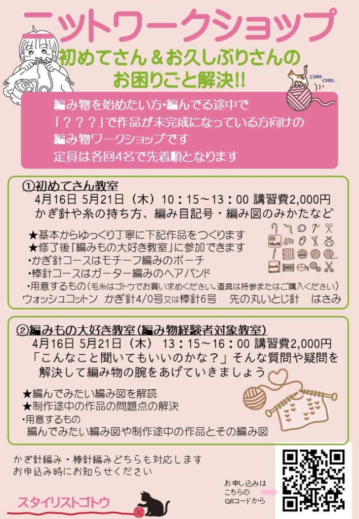 駅西店 4月5月開催『お困りごと解決!ニットワークショップ』