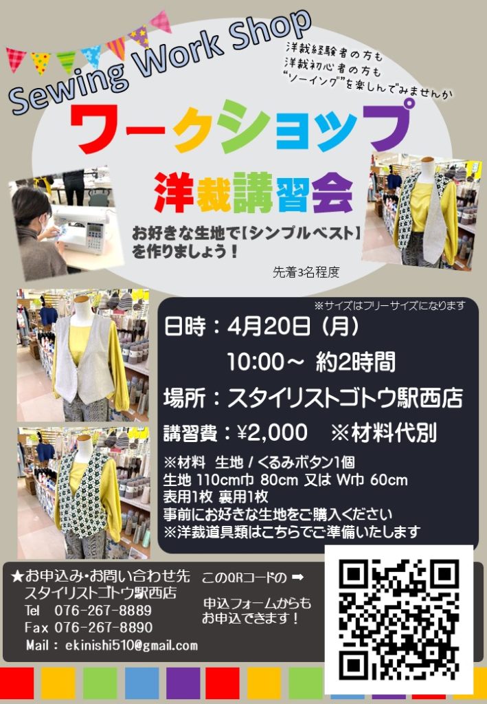 駅西店 4月開催 リバーシブルベストソーイングワークショップ