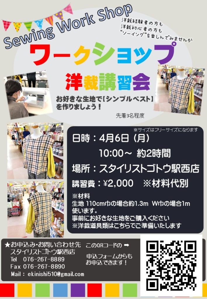 駅西店 4月開催 シンプルベストソーイングワークショップ