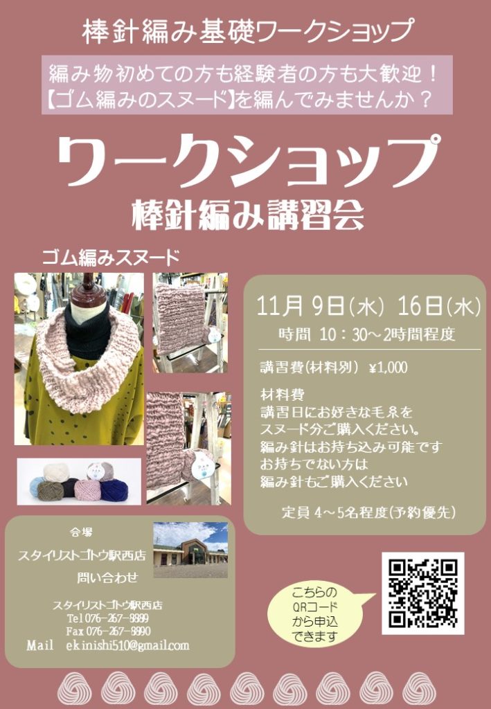 講習日にお好きな毛糸をスヌード分ご購入ください。